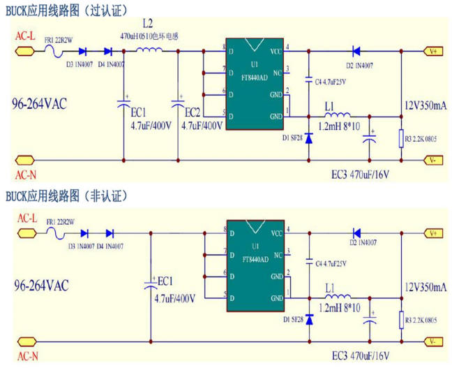 FT8440AD 支持 Buck 与 Buck-Boost 双拓扑,同一套 BOM 只需改 2 个器件即可切换,方便一张 PCB 兼容 110 V 与 220 V 市场。
