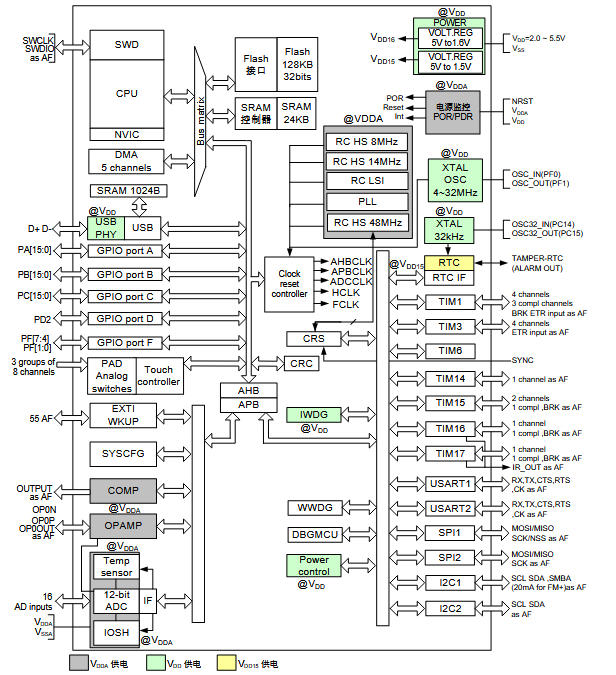 | CBAT7 | LQFP48-7×7 | 128 k/24 k | 37 | 16+6 int | 2/2/3 | 24 | 兼容 STM32F072 48Pin | 6 周 |